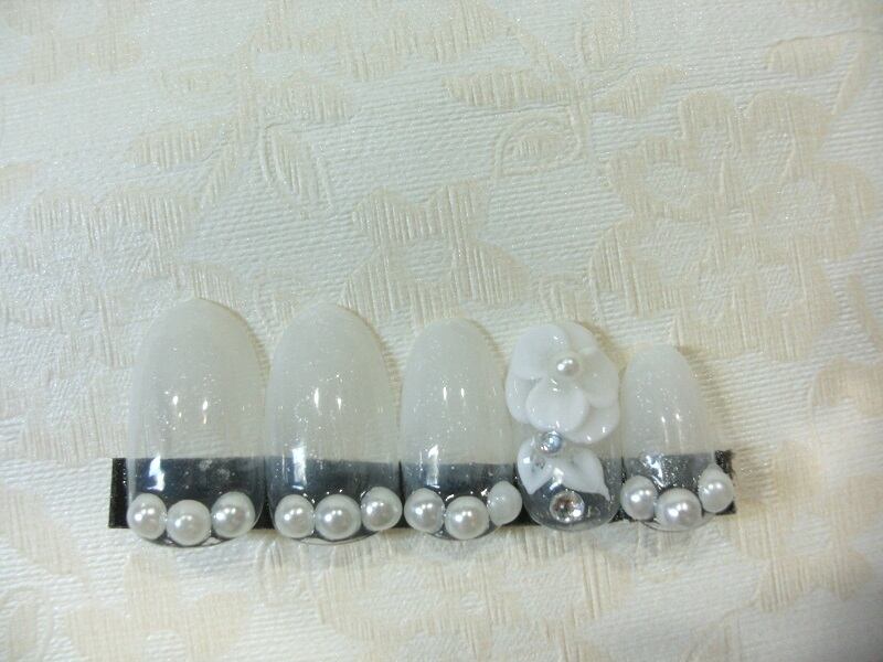 (クリックポスト発送込み) ブライダルにも ホワイトのグラデーションに3D&パールストーン でネイルチップ