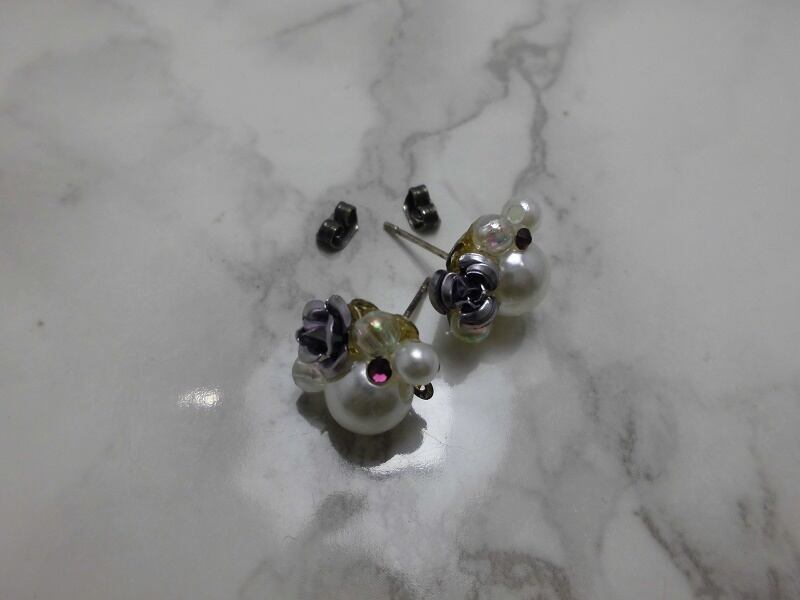 パール&ストーン(穴あき)とパープルのアルミ薔薇でピアスに