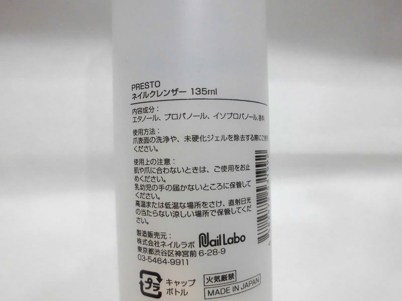 プレパレーション時の爪表面の油分・水分除去や、未硬化ジェルのふき取りに使用します。