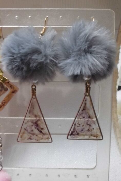 (イヤリングへの変更可能) ボンボンファーとレジンでべっ甲 ピアス