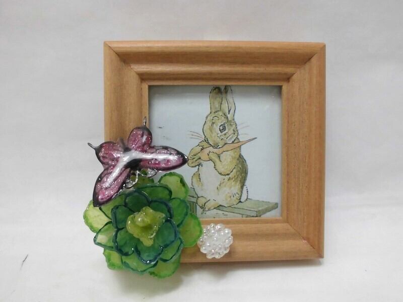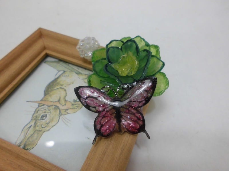 レジンで作成した蝶々とプラ板に着色してレジンコーティングしたお花をミニフレームにデコレーション