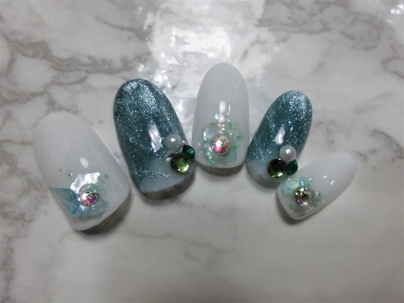 オーロラストーン、ペリドット、エメラルド、パール、ホワイトシェル、グリーンシェル